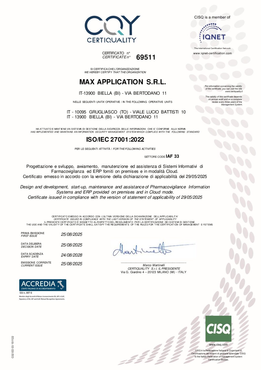 Achieving this certification means having successfully passed an independent audit that verified the strength of our processes and our ability to prevent, monitor, and manage risks related to information security. It is an objective guarantee: the data entrusted to Max Application is protected by rigorous procedures, continuously updated and aligned with the highest international standards.