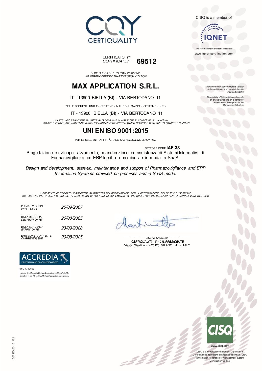 Since 2007, Max Application has been certified according to the international ISO 9001 standard, recognized as the most widely adopted global benchmark for quality management. This achievement is not a one-time milestone but an ongoing commitment, renewed over the years, to ensuring robust processes and services that consistently meet expectations.